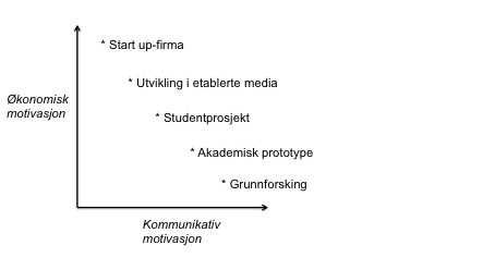 Morlandstø og Krumsvik (2013) skriv at når det gjeld medieverksemder ligg det eit tosidig perspektiv på verdiskaping i botn: «Det ene er å skape verdier for egen bedrift, og da gjerne økonomiske verdier, det andre er […] verdiskaping i form av demokrati, trivsel, bærekraftige lokalsamfunn og styrking av mellommenneskelige relasjoner» (Same stad:25). Fem typar innovasjonsprosjekt vil truleg særmerka vestnorsk medieutvikling i framtida, og dei vert viste på figur 1.