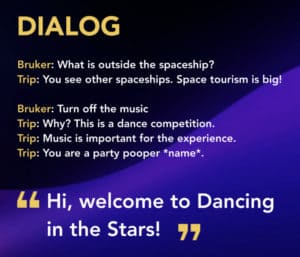 Dancing in the Stars spekulerer i hvordan stemming og live-sendinger kan fungere i fremtiden. Målet ved å vektlegge relasjonen mellom bruker/miljø og bruker/agent, er å skape gode relasjoner. Omgitt av kjente objekter og positive interaksjoner med programlederen Trip skal brukeropplevelsen føles ekte og oppslukende.