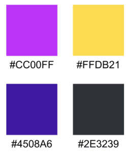 Eurovision og Skal vi danse er to overdådige konsepter med glitter og glam. For å oppnå denne følelsen bærer designet preg av nattklubb og sci-fi. Fargeprofilen er inspirert av galaxy-stilen, med nyanser av lilla som hovedfarger i tillegg til en gull-farge som er inspirert av glitterkonfetti og stjerner. Neonskiltene har gruppen designet selv i Figma.
