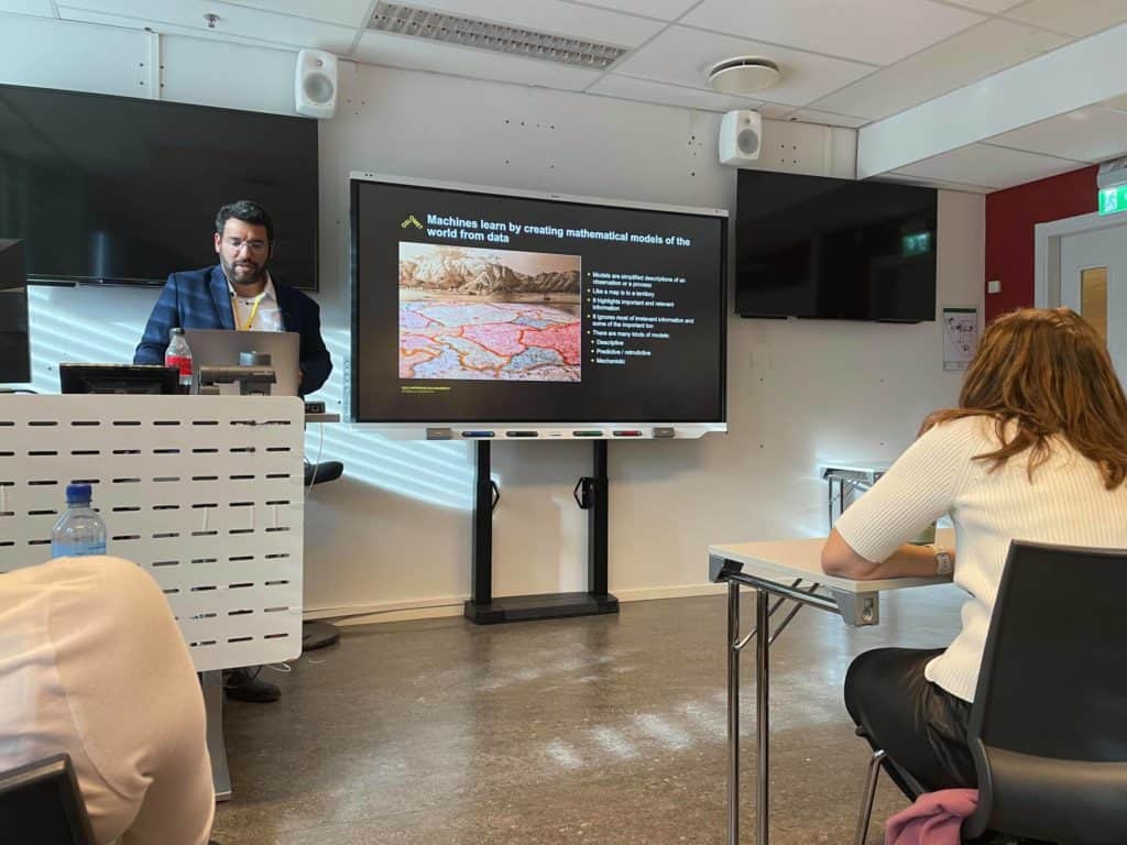 Men workshopen var spennende likevel, og teamet fra OsloMet Artificial Intelligence Lab var kjempeflinke til å introdusere kunstig intelligens. De startet litt med tanken bak AI, historien så langt, for så å gradvis bevege seg videre. Vi lærte skillet mellom supervised og unsupervised learning, og hvordan de forskjellige metodene kan brukes. Videre fikk vi se enkle eksempler på hvordan regresjon kan brukes til å lage enkel AI. Vi utforsket også et datasett sammen, og vi fikk stilt spørsmål underveis.