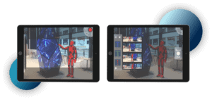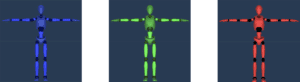 The prototype's user interface consists of an asset palette of three robots which are colored red, green, and blue. The body tracking initiates once a person enters the camera frame and you tap on the robot. A model of the chosen robot then appears overlayed, tracking the skeletal movements of the person.