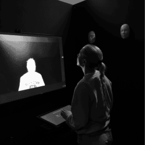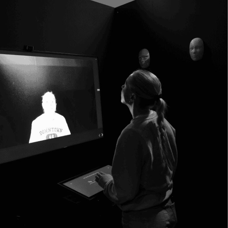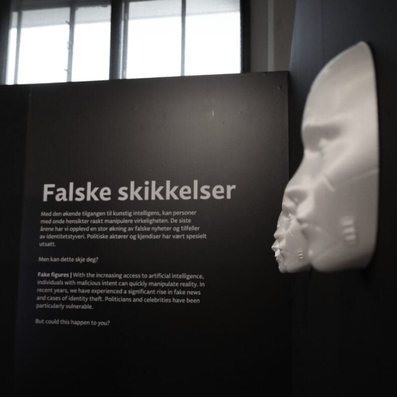 I installasjonen Falske skikkelser vil det genereres deepfake av de besøkende, uten at de får informasjon om dette. Det gjenspeiler realiteten av deepfakes i samfunnet vårt, det vil skje utenfor vår kontroll. Med den økende tilgangen til kunstig intelligens, kan personer med onde hensikter raskt manipulere virkeligheten. De siste årene har vi opplevd en stor økning av falske nyheter og tilfeller av identitetstyveri. Politiske aktører og kjendiser har vært spesielt utsatt. Men kan dette skje deg?