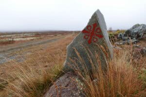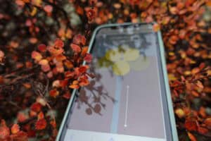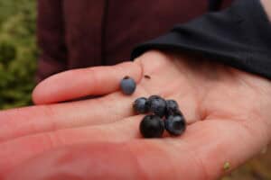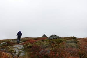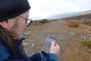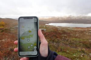 Dag én henger tåken lavt over Hjerkinnhøe, der ruten vår starter. Vi legger opp til orientering denne dagen, med målsetting om å nå de laveste punktene på ruten. Vi ender opp med å gjøre mer enn vi har planlagt, både å teste de ut viktigste funksjonene i systemet og å dokumentere turen med bilder og feltnotater underveis. Dessuten fikk jeg samlet inn fargekoder og teksturer fra det praktfulle høstlandskapet som skal brukes til neste iterasjon i designet. Testen fra dag én viser at både posisjoneringen og avspillingen av innholdet fungerer greit, til tross for sviktende internet-dekning. Dette da vi benytter komprimerte lydfiler for å korte inn på nedlastingstiden. Vi finner også ut av at det er lett å gå forbi punkt dersom man navigerer utfra visuelle ledetråder langs ruten, som f.eks. skilt eller varder. Til sist gjorde vi et funn som vi ikke kan dele; den beste plassen for å plukke bær langs ruten.