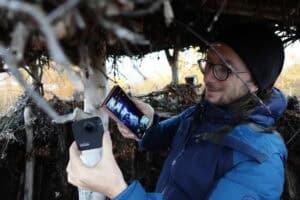 Når vi har funnet oss vel til rette på Villreinsenteret begynner vi å forberede neste etappe av turen. Med oss har vi en del utstyr, bl.a. en beta-versjon av mobilguiden, med gps-posisjonering og noe innhold. Vi tar også med noen grafiske skisser som vi vil teste ute i forskjellig lyssettinger.