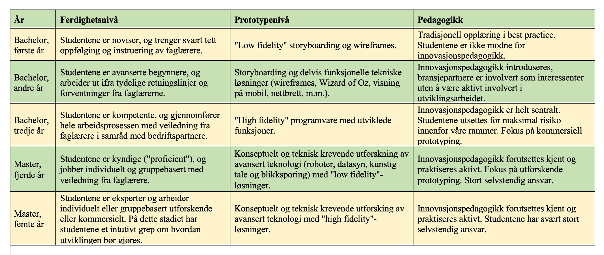 Vi har som målsetning å løfte studentenes evne til å utvikle og teste prototyper fra nybegynnernivå til ekspertnivå i løpet av den femårige utdanningen (se modell 1).