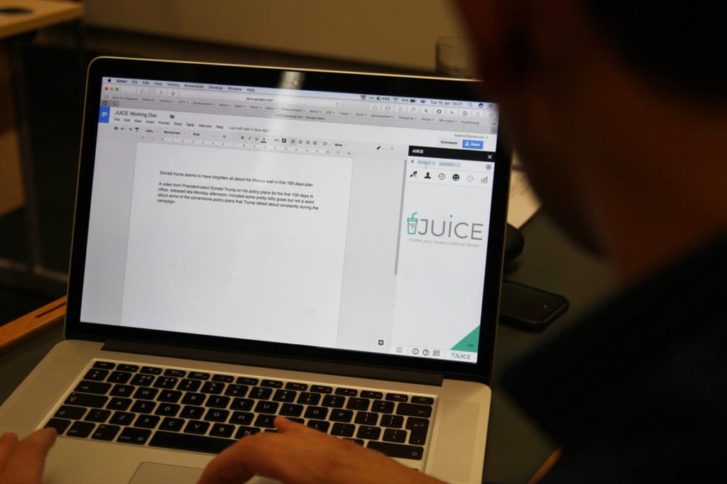 JUICE is implemented as a simple Add-on Sidebar and Dialog Box in Google Docs. – JUICE presents the journalist with creative clues and ideas about new angles for a news story that they are currently writing in Google Docs, says Professor Neil Maiden.