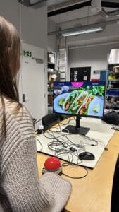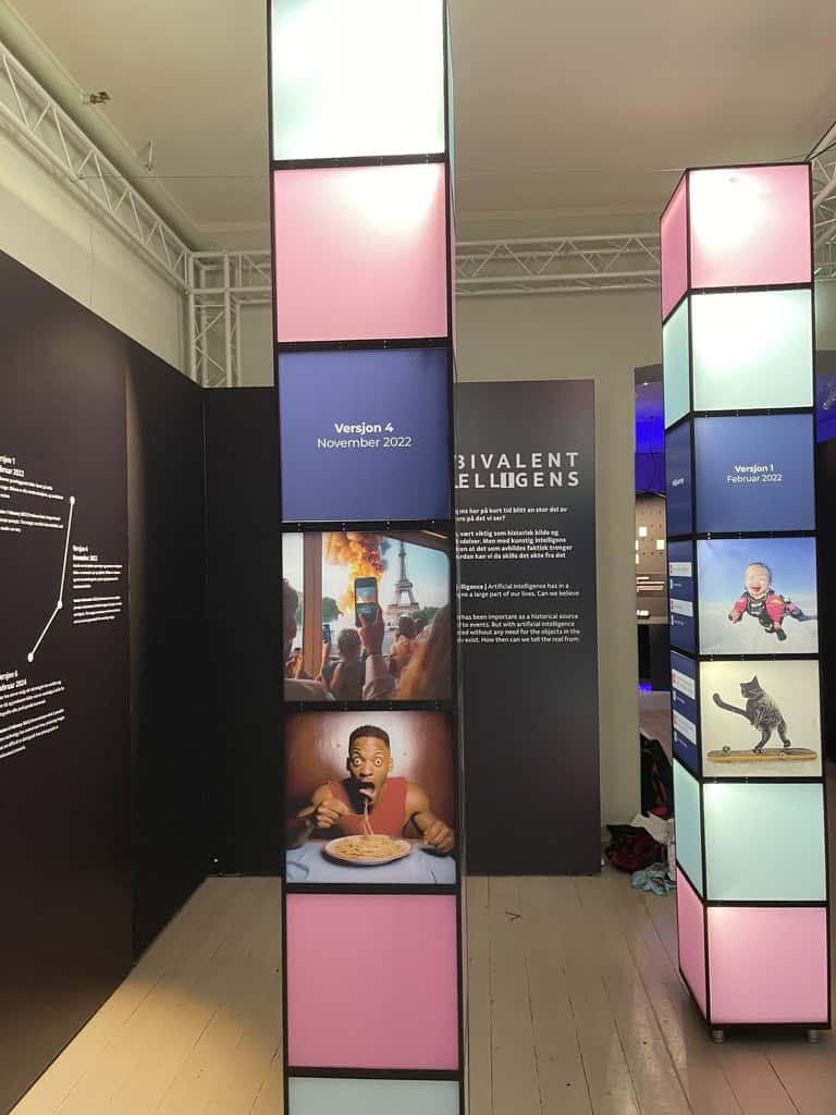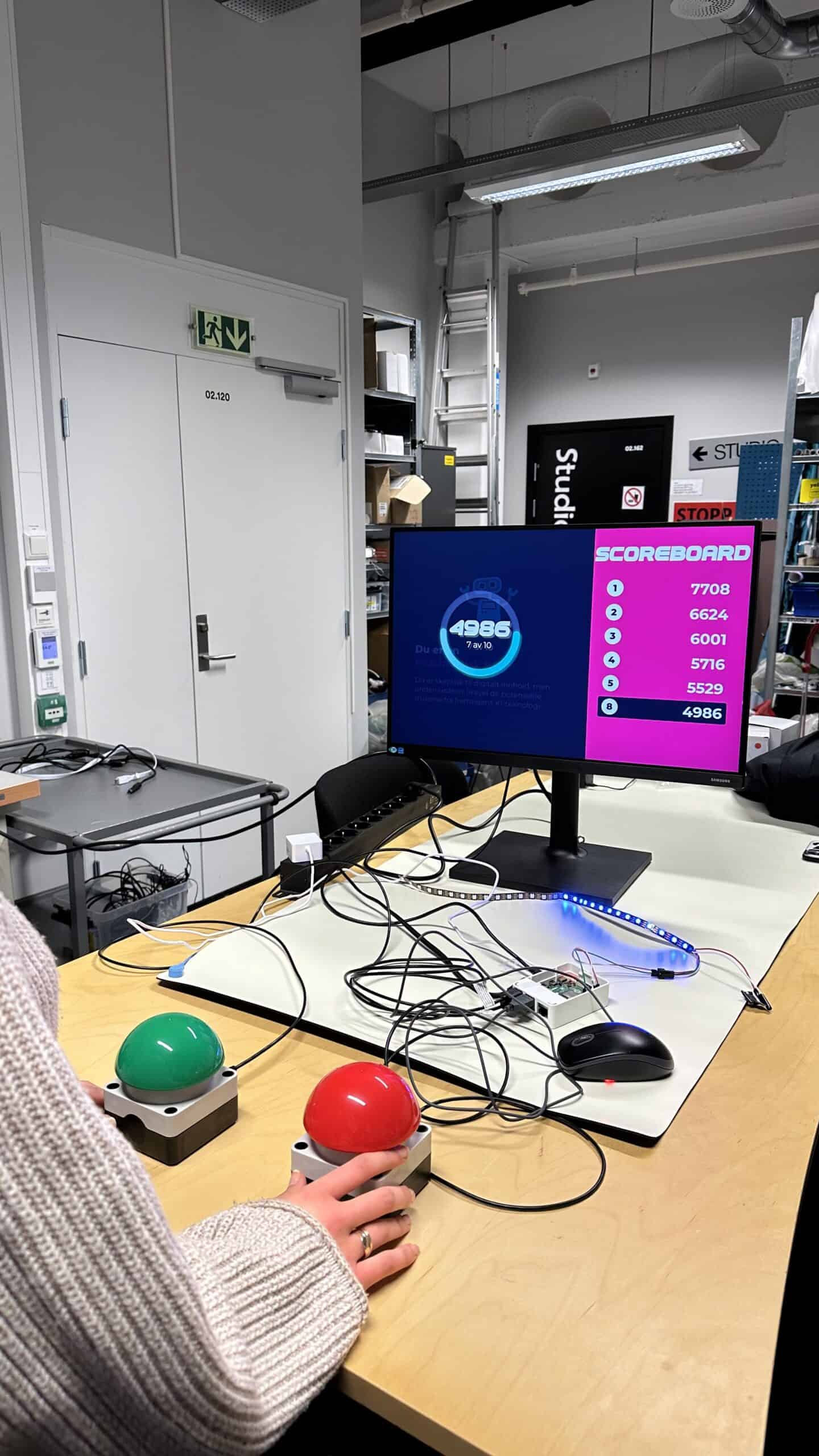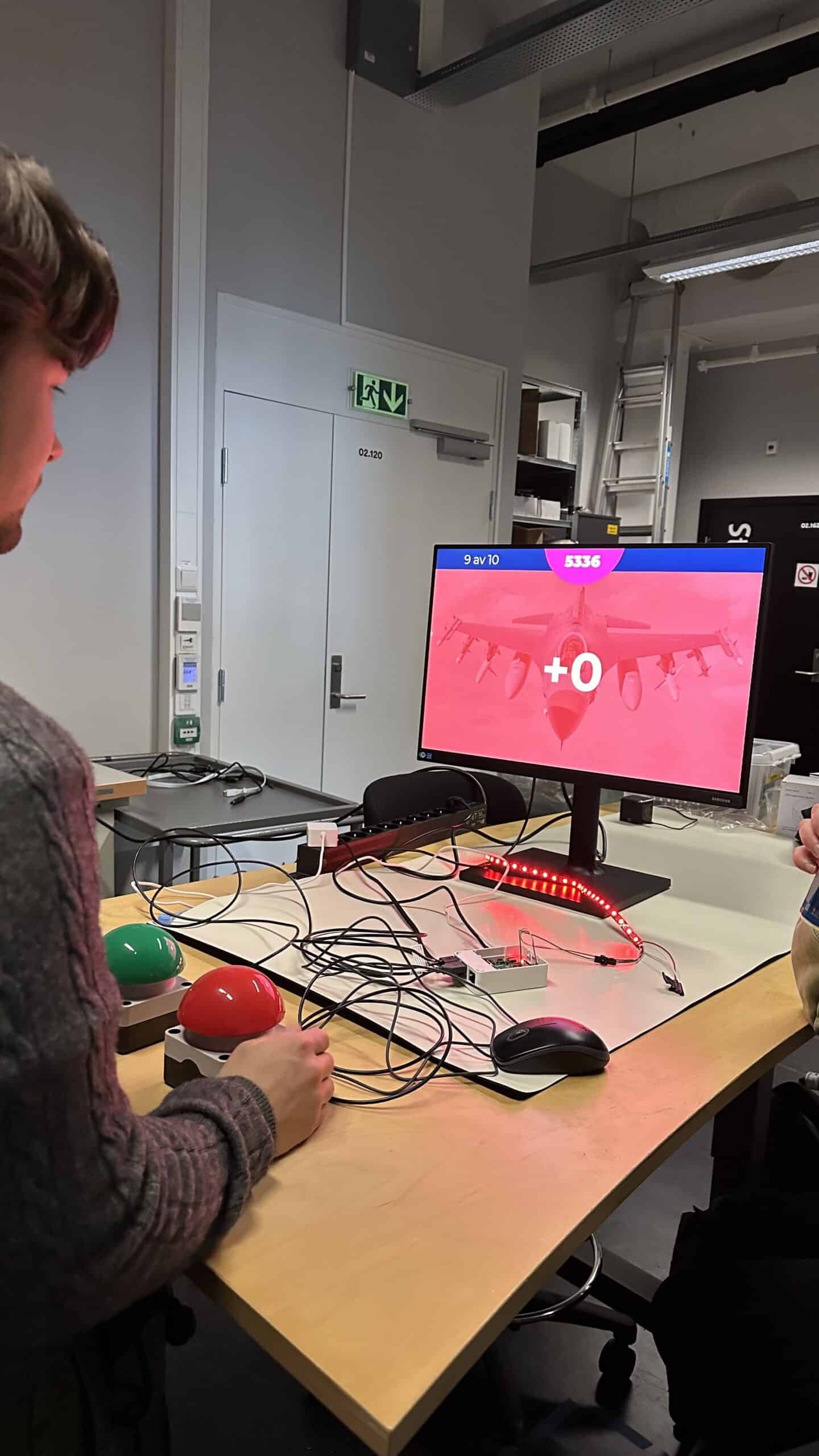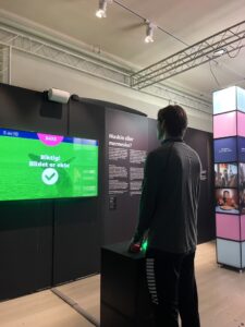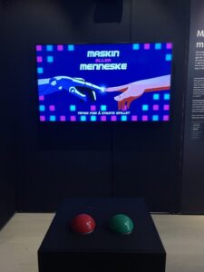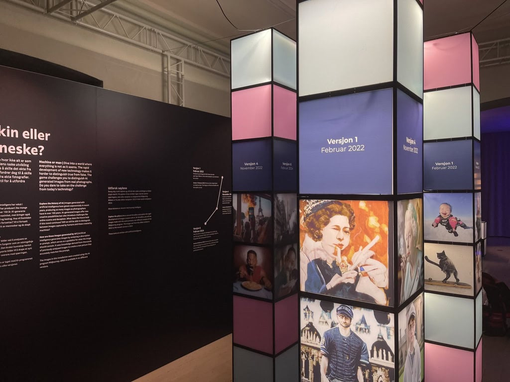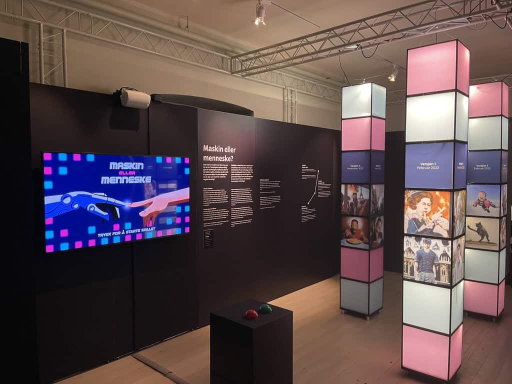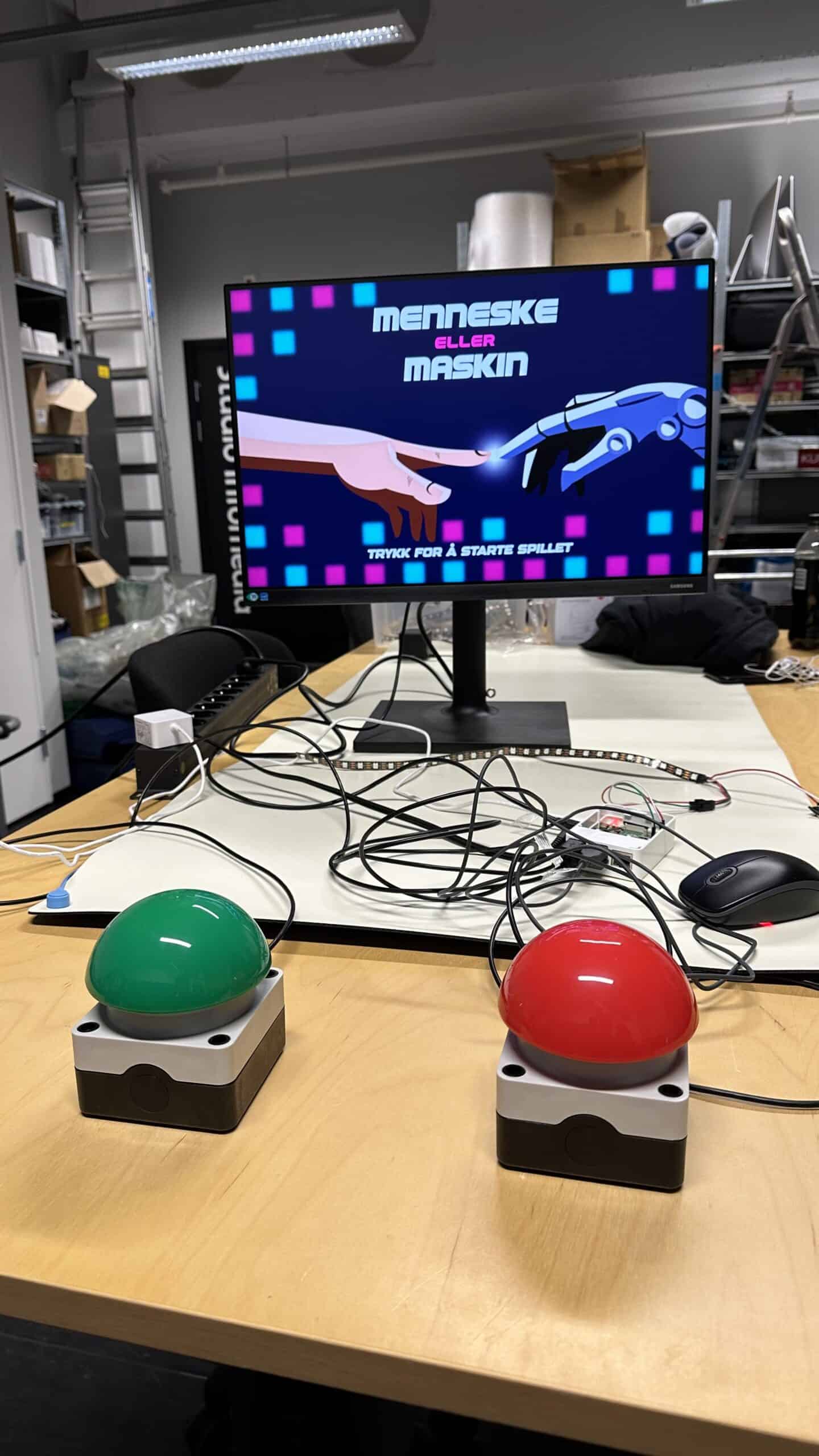 Utforsk fremtidens teknologi gjennom Maskin eller Menneske utviklet i samarbeid med Universitetsmuseet i Bergen. Installasjonen inviterer besøkende til å teste sine ferdigheter i å skille mellom ekte fotografier og bilder generert av kunstig intelligens. Ved å trykke på en av knappene - grønn for "ekte" og rød for "falsk", konkurrerer deltakerne om en plass på ledertavlen.