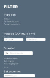 Her får brukeren mulighet til å filtrere søkene sine, slik at det blir lettere å finne frem til riktig dom. Brukeren mulighet til å lagre dommer på profilen, i tillegg til en automatisk oppsummering av hva som har skjedd siden sist ved innlogging.