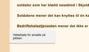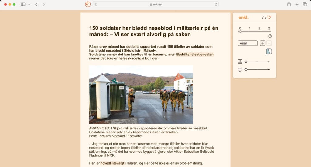 Prototypen bruker en artikkel fra NRK for å teste ulike forenklingsnivåer og andre verktøy. Den valgte artikkelen omhandler en hendelse på en militærkaserne der 150 soldater har hatt neseblødninger i løpet av en måned, og beskriver tiltak som er blitt iverksatt.