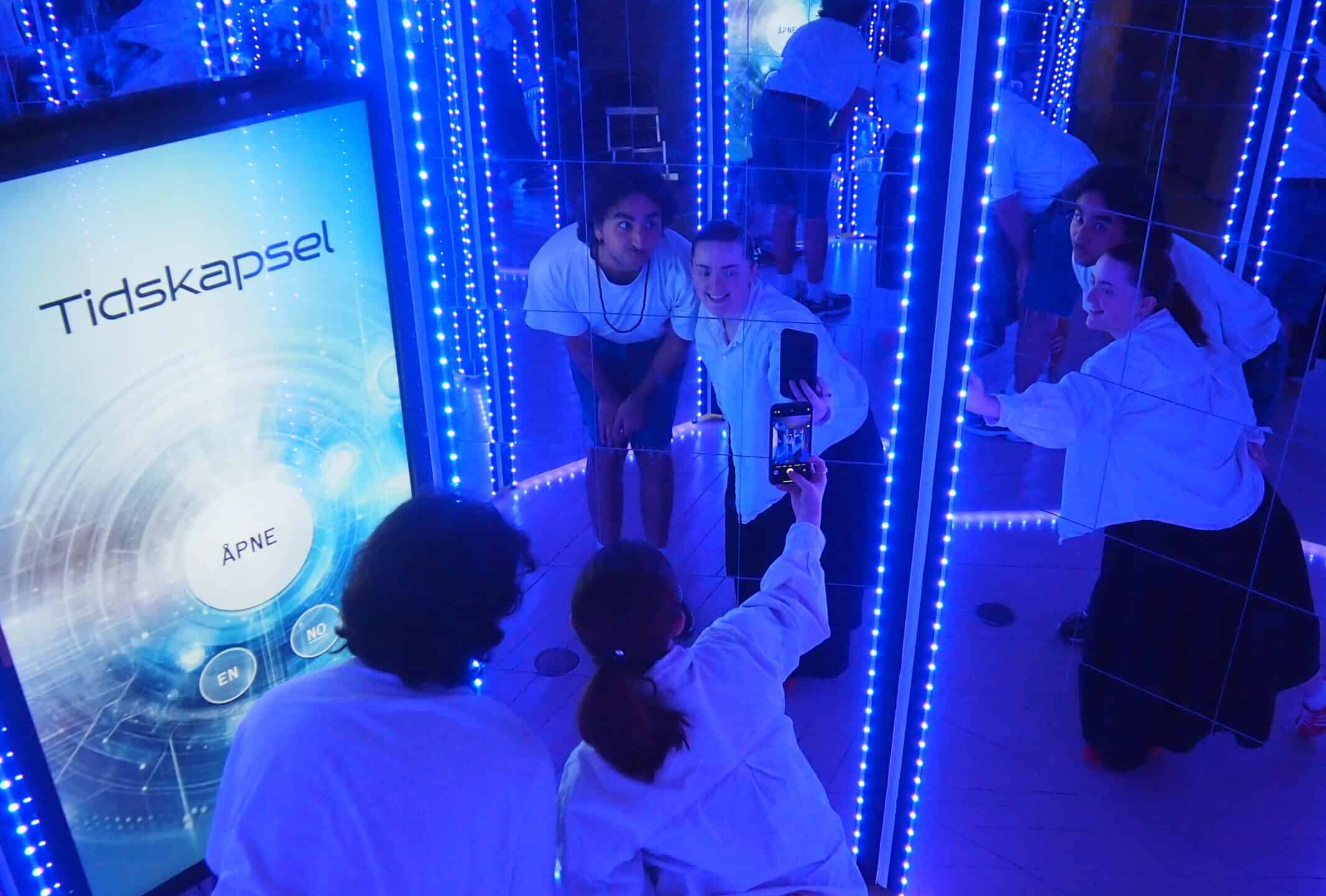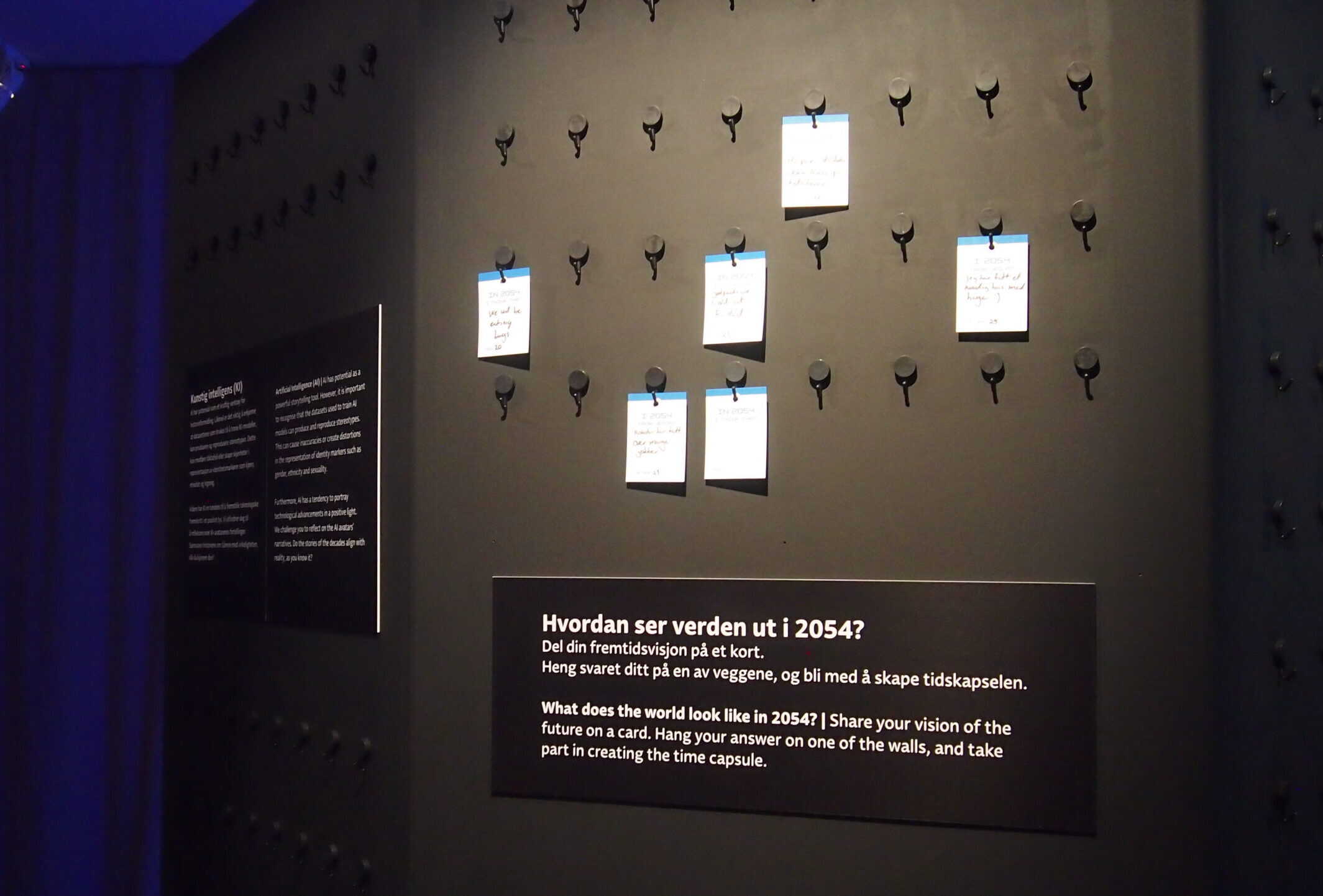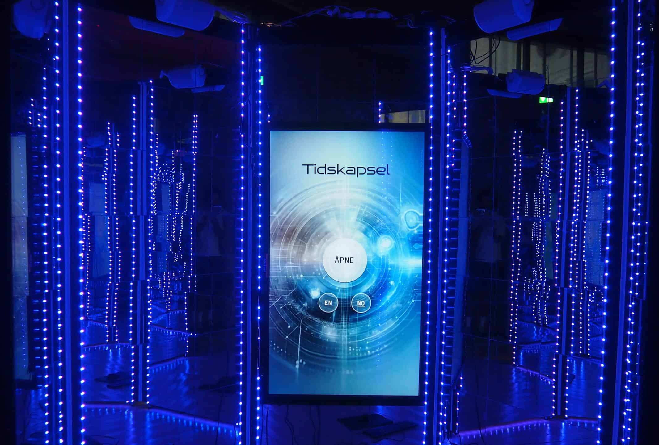 I installasjonen går du inn i en tidskapsel dekket av speil og blå LED-lys. På innsiden møter du KI-ungdommer fra tidligere tiår på trykkskjermen. De snakker om hvilken teknologi som var i vinden og hva som rørte seg i samfunnet. På utsiden tar du del i å bygge en fysisk tidskapsel: skriv ned din fremtidsvisjon for 2054 på et kort og del svaret ditt på en av tidskapselens vegger.