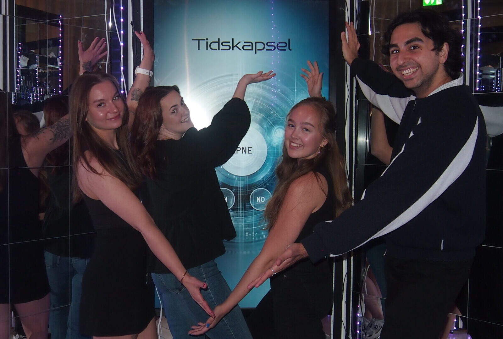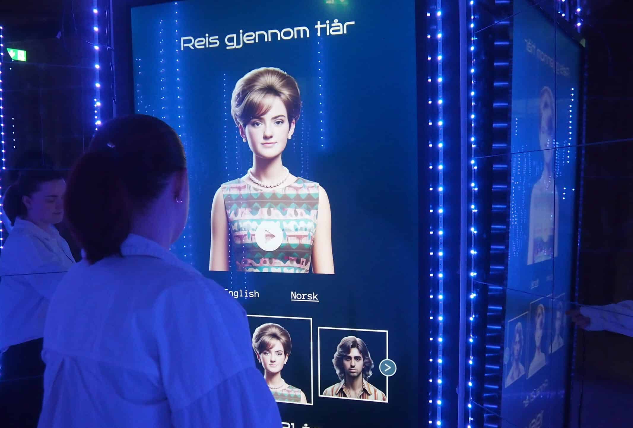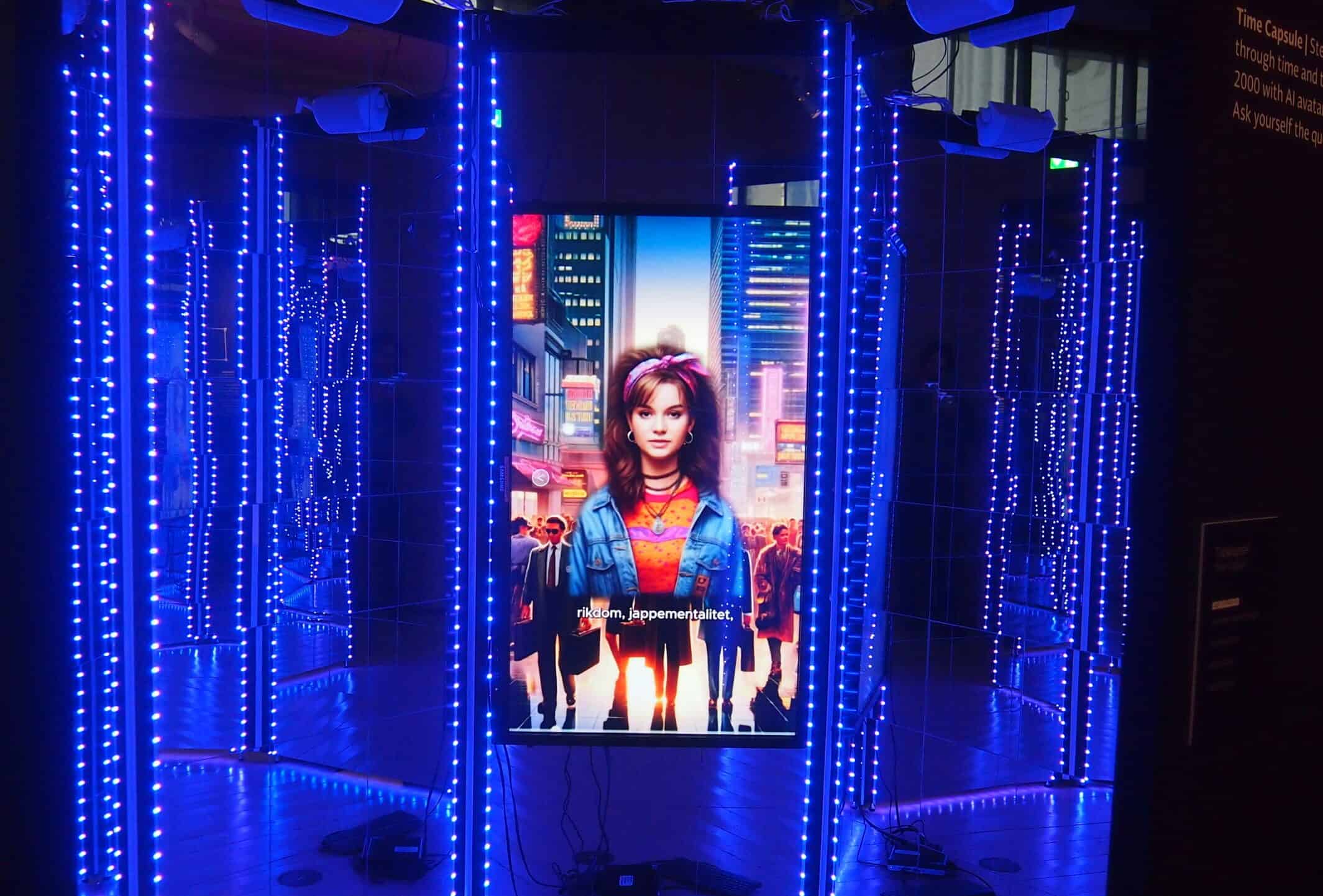 I installasjonen går du inn i en tidskapsel dekket av speil og blå LED-lys. På innsiden møter du KI-ungdommer fra tidligere tiår på trykkskjermen. De snakker om hvilken teknologi som var i vinden og hva som rørte seg i samfunnet. På utsiden tar du del i å bygge en fysisk tidskapsel: skriv ned din fremtidsvisjon for 2054 på et kort og del svaret ditt på en av tidskapselens vegger.