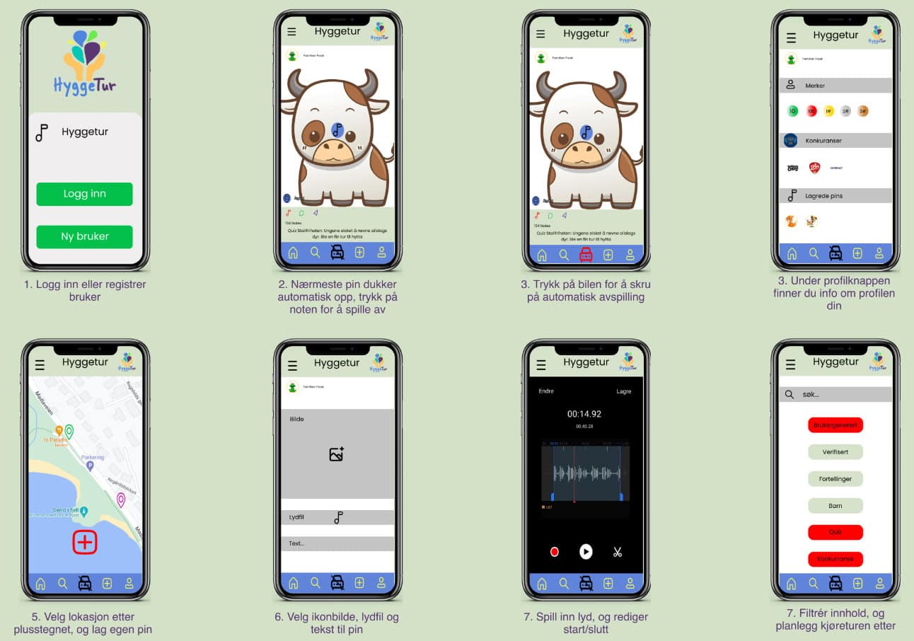 Hyggetur er en app for hele familien, som skaper harmoni og stimuli for barn og voksne under kjøreturer. Brukerne blir underholdt med funfacts, quizer, lek, og konkurranser knyttet til områdene langs ruten de kjører til hytta.