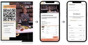 The prototype displays a banner with a QR code on the show God Morgen Norge, which will be shown on screen for 60 seconds. The segment on air is Wenchewho is cooking a recipe. If the viewer decides to scan the QR code, they will be brought to a website that contains the recipe and its ingredients. At the bottom of the website, the viewer can choose to purchase the ingredients directly from Kolonial, an online grocery store.