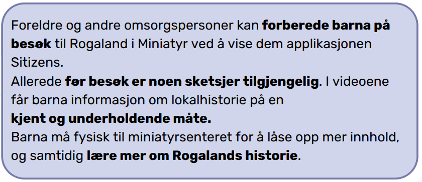 Sitizens ønsker å bruke skjermene som hjelpemiddel. Ved å lage en applikasjon med lærerikt og morsom innhold i et gjenkjennbart format (sketsjer og underholdende innhold i et format lignende hva vi ser på tiktok), vil dette gjøre lokalhistorie interessant for barna. Ved å lete etter QR-koder får barna låst opp mer innhold, og de får digitale medaljer.